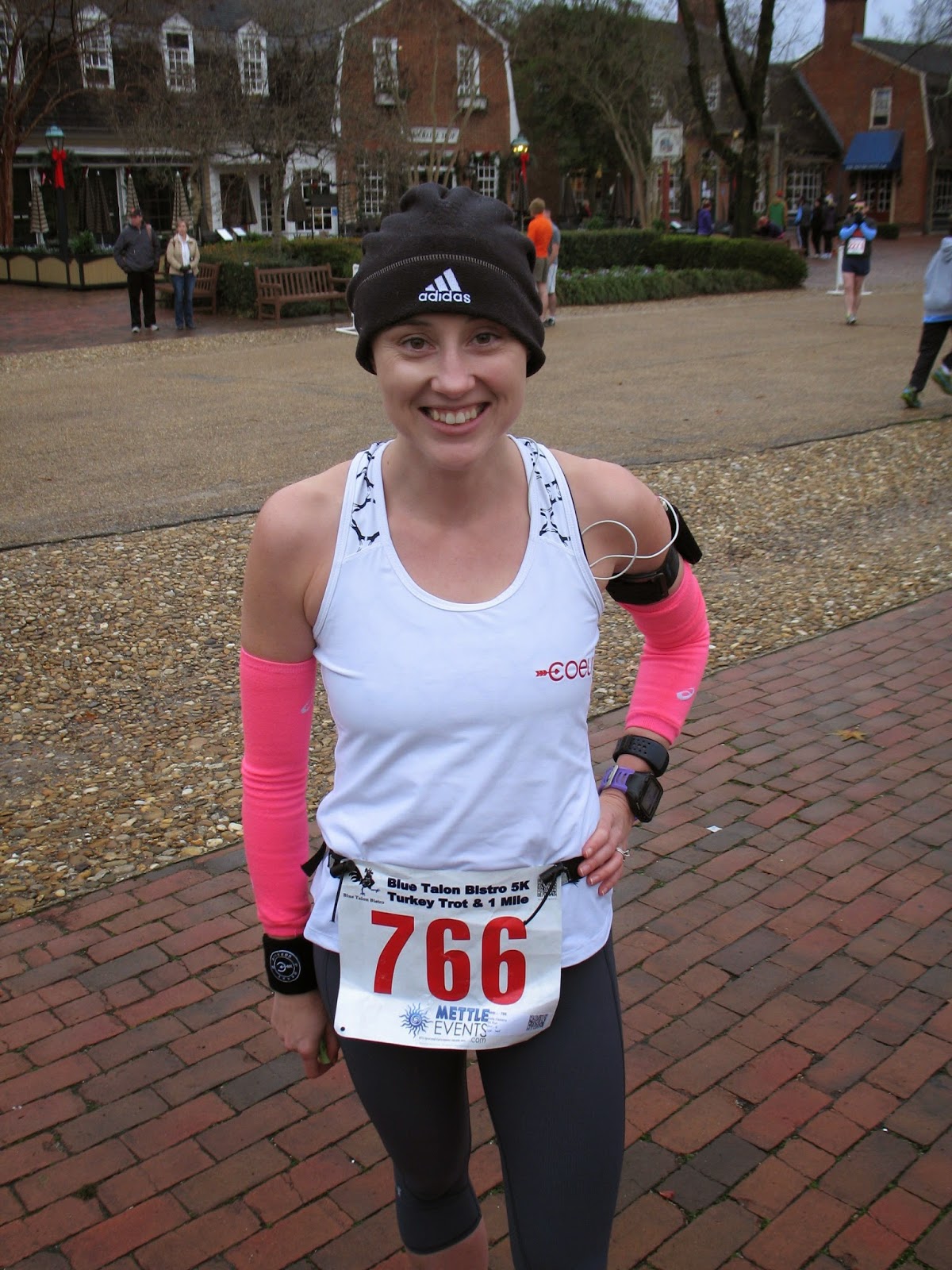 One of the most popular days to run a race is probably Thansgiving in the form of a Turkey Trot. Nick and I spent Thanksgiving day in historic Williamsburg. I ran the Blue Talon Bistro 5k which was fantastic. I highly recommend this one. It was well organized. They even had two divisions, one for runners and one made up of walkers. The number bibs had bar codes so you could use an app such as red laser on you cell to get immediate results. That was fun to check in the end. My friend Bernie & her hubby also ran. The course is fun & scenic taking athletes through the quaint little town and through parts of the William & Mary campus. It was fairly flat at first with a few little hills throughout to keep things interesting.