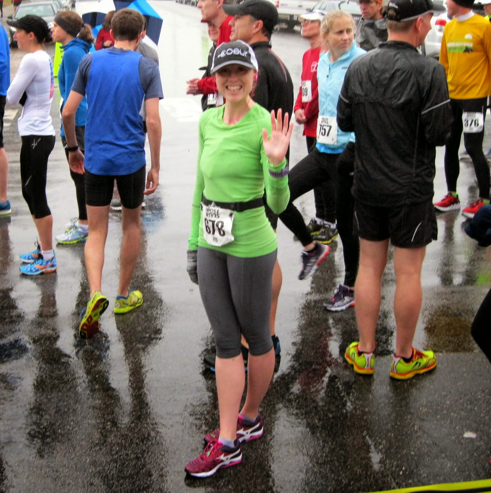 I warmed up outside in the storm. Then, poor Nick showed up hauling my heavy pre race back pack and he cringed as I removed and added and removed layer after layer indecisively. I piled his arms with dripping wet hoodies and jackets and wind pants. We saw a few more friends and I tried to keep calm about the race by worrying about my wardrobe! ha!