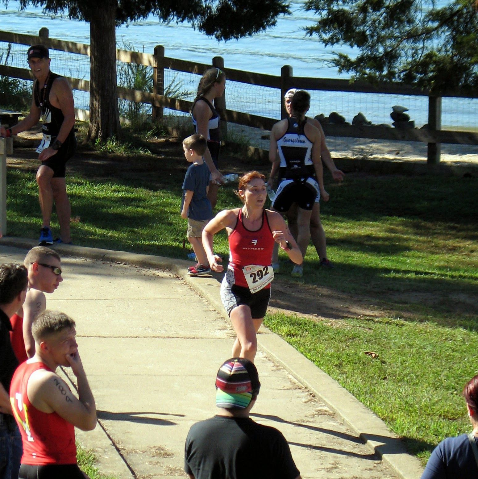 I was willing them to push those pedals into a zone 4 effort but I fell into zone 2 watts and it hurt. The muscles did not want to turn the pedals. The course was rolling and beautiful though, with perfect weather so I did have a lot of fun going up and down the hills. I was just not on my game, but still enjoying the day which was a goal. I did take my shoes off far too early after turning into the park so I think that lost me some time as I wasn’t able to push the descent for speed, but I did have a great dismount running into T2.